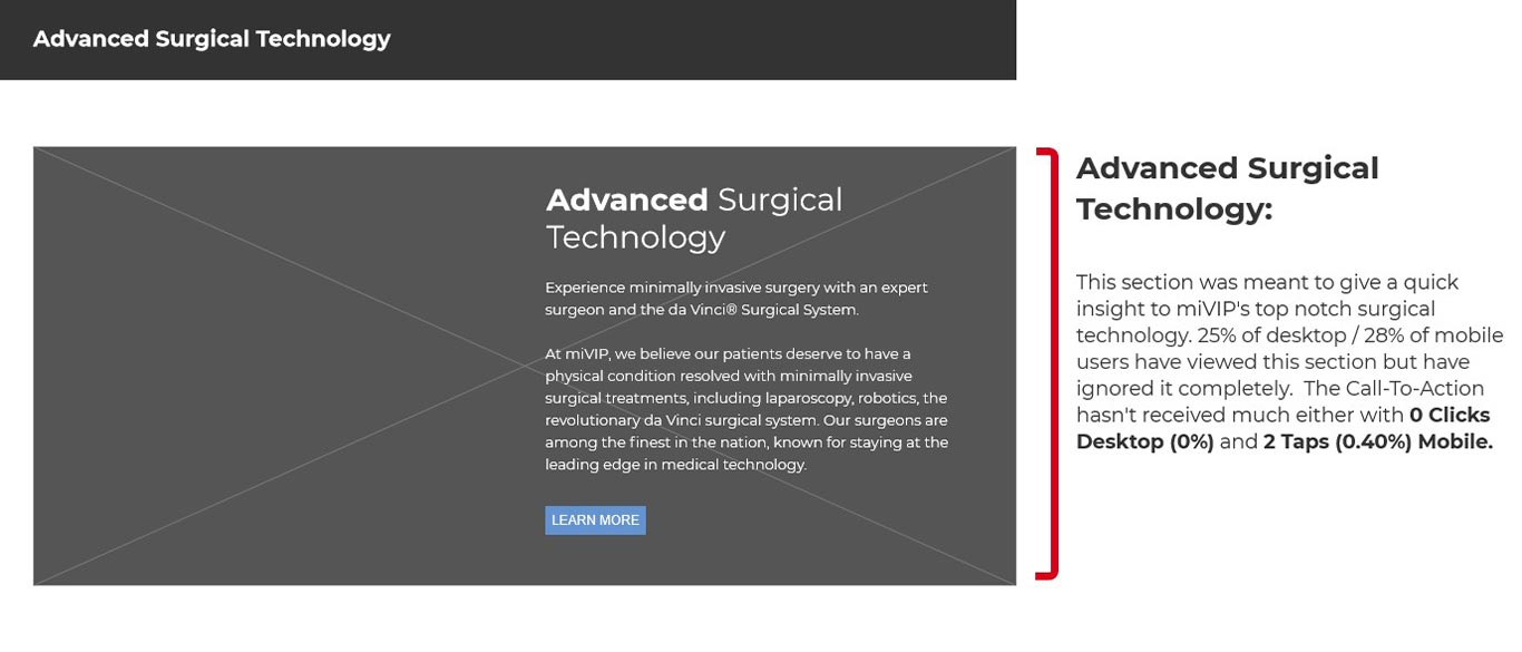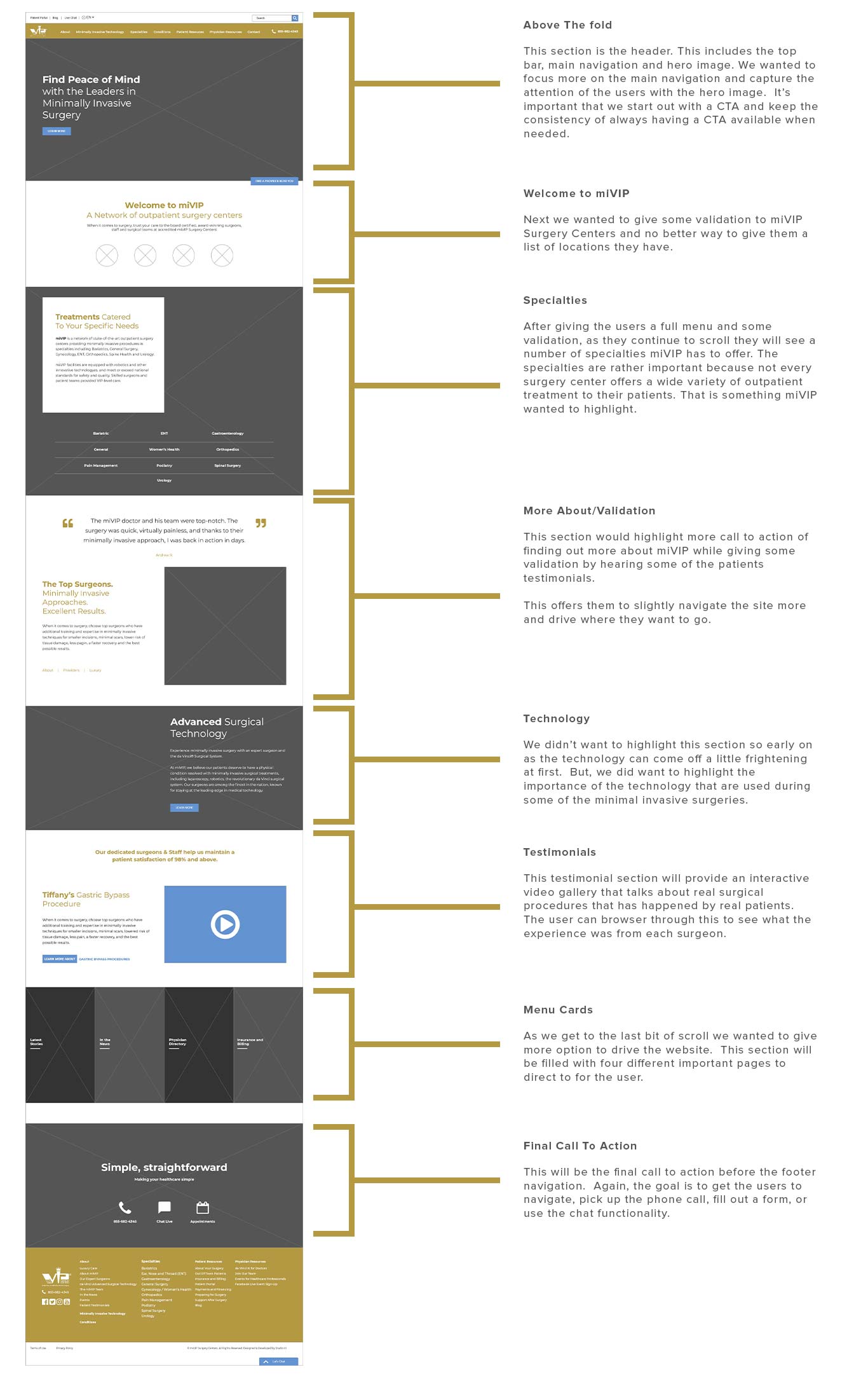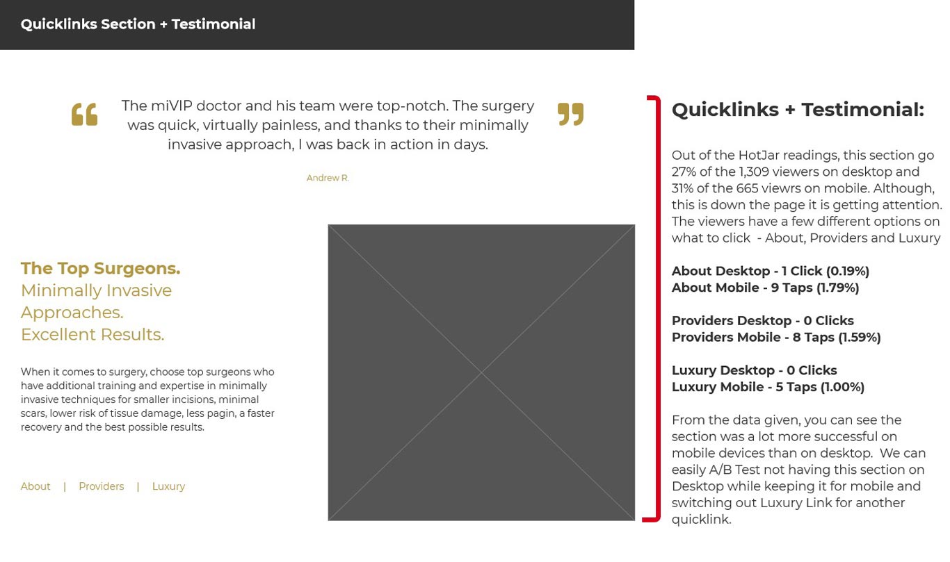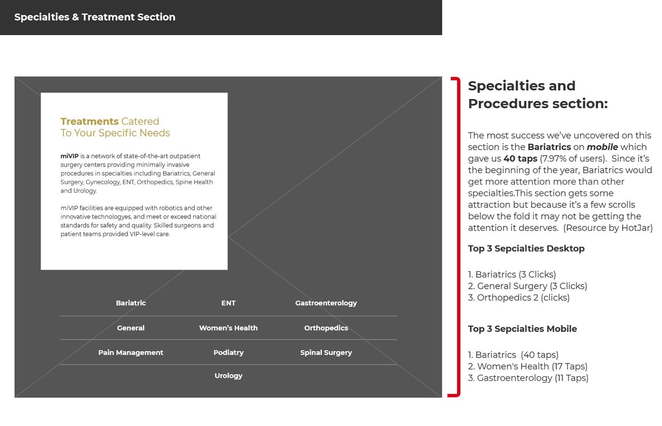 For miVIP, the design process was pretty straight forward. Thankfully, we had some analytics pulled from HotJar and Google Analytics to help us with this process. With all our data, and collaboration ideas for the design, Studio 3 was hired to develop most of the front end. Along with our FullStack Developer, our developer handled most of the heavy lifting when it came to the backend data with our physicians and forms.